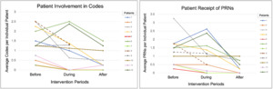 Change in externalizing symptoms (eg, behavioral dysregulation, verbal/physical aggression) was measured by documentation of patient involvement in codes and number of PRNs received due to agitated behavior, while change in internalizing symptoms was measured by patient self-report of mood, for the 4 weeks before, 8 weeks during, and 4 weeks after the intervention. These time frames were maximized to the extent possible, with limitation by the unpredictable nature of admissions/discharges on the unit. Average codes and PRNs were initially calculated for each patient per intervention period, followed by interrupted time series (ITS) analysis looking at change in collective average codes and PRNs per week. ITS was chosen to assess available longitudinal data in context of a preintervention/postintervention structure but no true control group due to logistic constraints.