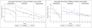 Although ITS analysis reflected a net reduction in average codes and PRNs during and following the intervention (Figure 2), it is not possible to say from this whether LMT was contributory beyond treatment as usual (TAU). Of note, the rate of decrease in average weekly codes was not statistically significant before LMT began but became statistically significant after the intervention; however, the model’s estimate of the intervention’s contribution to this rate of change was positive and not statistically significant by itself. Likewise, the rate of change to average daily PRNs was sharply negative before LMT began and became less sharply negative afterward, while the model’s estimated impact of the intervention was positive.
